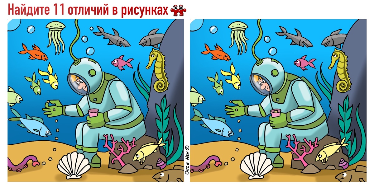 Найдите 11 различий на картинках про подводный мир. Тест на внимательность и задачка для памяти