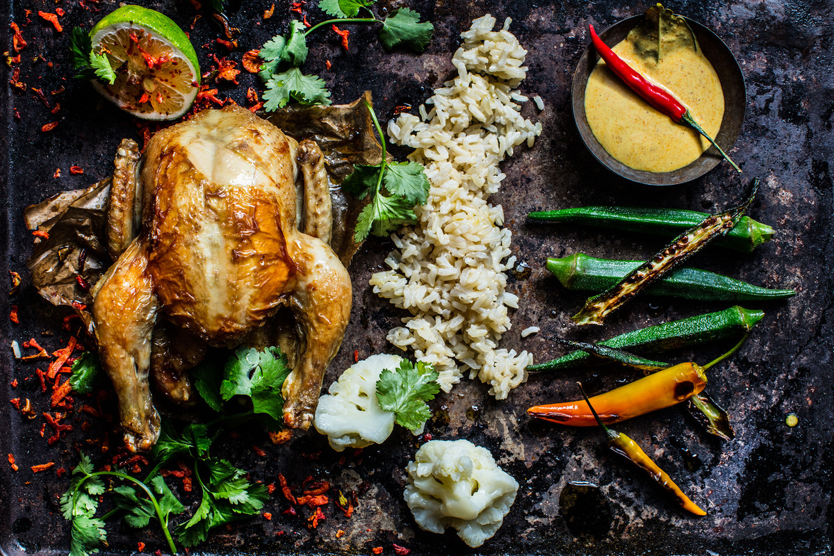 Запеченая курица с овощами, рисом и соусом карри. Приготовление блюд для меню.