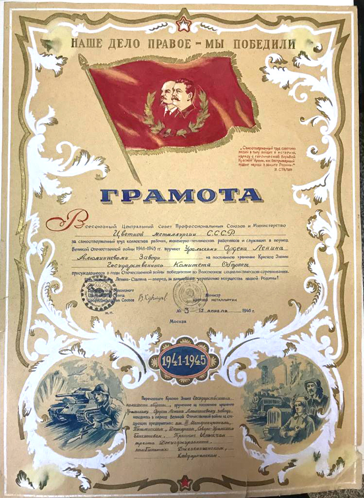 Вручение знамени ГКО на постоянное хранение Уральскому алюминиевому заводу