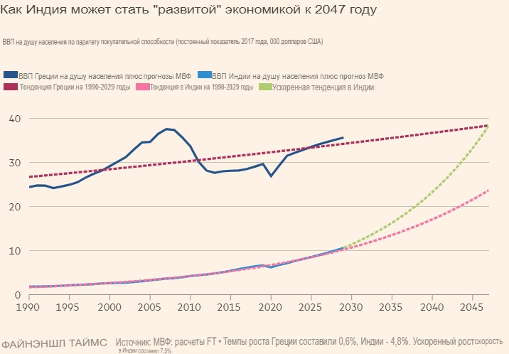 В 2023 году ВВП Индии на душу населения по паритету покупательной способности (ППС) составлял чуть менее четверти от ВВП Греции. Если ВВП Греции на душу населения вырастет всего на 0,6 процента (тенденция 1990-2029 годов, по прогнозам МВФ), а Индии — на 4,8 процента (тенденция 1990-2029 годов), ВВП Индии на душу населения составит всего 60 процентов от ВВП Греции в 2047 году. Если ее ВВП на душу населения сравняется с ВВП Греции к 2047 году, темпы роста ВВП на душу населения должны будут вырасти до 7,5 процента в год. Этот темп роста не будет намного ниже темпов роста Китая в период с 1990 по 2012 год, когда он достиг поразительного годового темпа в 9 процентов. (См. диаграммы.)