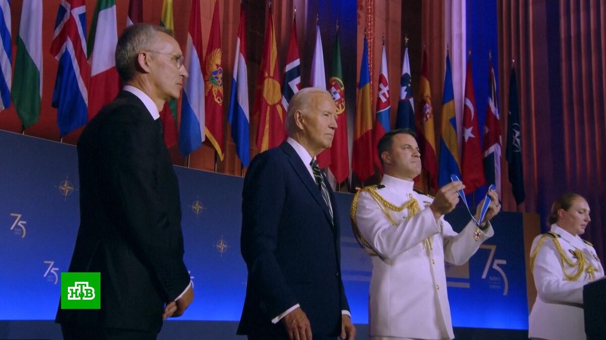 [ Смотреть видео на сайте НТВ ] 75-летие НАТО не случайно решили отмечать именно в Вашингтоне. Саммит должен был подчеркнуть единство блока, показать уверенность в его будущем, а также выделить лидерство Соединенных Штатов и лично президента Джо Байдена. Но к началу ни с одним из пунктов не сложилось. Для Джо Байдена саммит оказался важен не столько содержанием, сколько возможностью доказать, что он по-прежнему в силах управлять страной и делать это еще 4 года. На церемонии открытия Байден говорил достаточно уверенно, но вновь по телесуфлеру, и его речь местами все равно прозвучала странно. Джо Байден, президент США: «Мы готовы, мы способны отразить любую агрессию и защитить каждый дюйм территории НАТО — на земле, в воздухе, на воде, в киберпространстве и в космосе». Какая именно территория стран НАТО находится в космосе, президент США уточнять не стал, а следом он заявил, что Россия хочет уничтожить культуру Урана. Джо Байден: «Путин хочет полного подчинения Украины. Покончить с демок