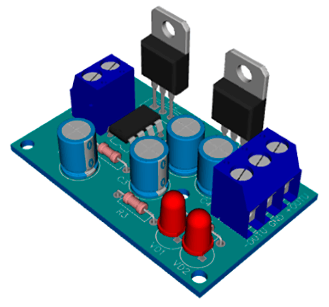 Большинство блоков питания в наличии у радиолюбителя являются однополярными, поскольку они проще в изготовлении и дешевле при покупке. Но зачастую при налаживании электронных устройств требуется двухполярное питание, которое надо синхронно включать и выключать и которое обеспечено защитой по току. Используя предлагаемую схему, можно доработать однополярный лабораторный блок питания и получить на выходе двухполярное напряжение, правда, с вдвое меньшим напряжением каждой полярности. Делитель на резисторах R1 и R2 делит входное напряжение пополам. Операционный усилитель (ОУ) LM358N DA1.1 сравнивает это напряжение с напряжением на искусственном общем проводе (GND) и подаёт управляющий сигнал на базы составных транзисторов VT1 и VT2. Один из этих транзисторов открывается, и оба напряжения выравниваются. При изменении входного напряжения в интервале 5...32 В схема «делит» его пополам. На ОУ DA1.2 собран, по сути, компаратор напряжения, который переключается в зависимости от того, какой из тр