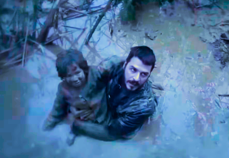 И вот спасительную верёвку хватает Мустафа. Ослабевший, он шепчет сыну: "Держи её, держи". Они должны вдвоём схватиться за неё.