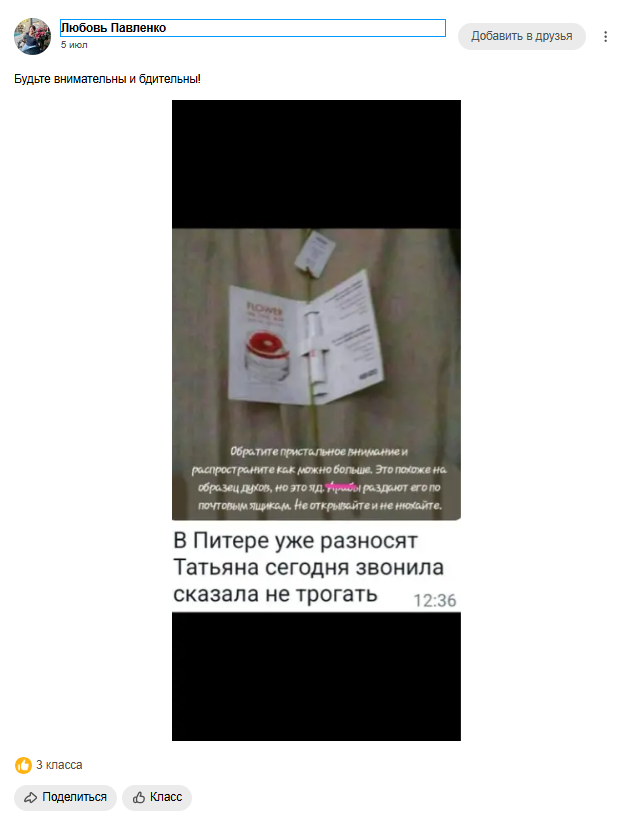 Пользователи соцсетей распространяют предупреждения о том, что злоумышленники подбрасывают в почтовые ящики отравленные пробники с парфюмом. Сообщения поступают из разных регионов страны. Это Москва, Санкт-Петербург, Тула и ряд других городов.