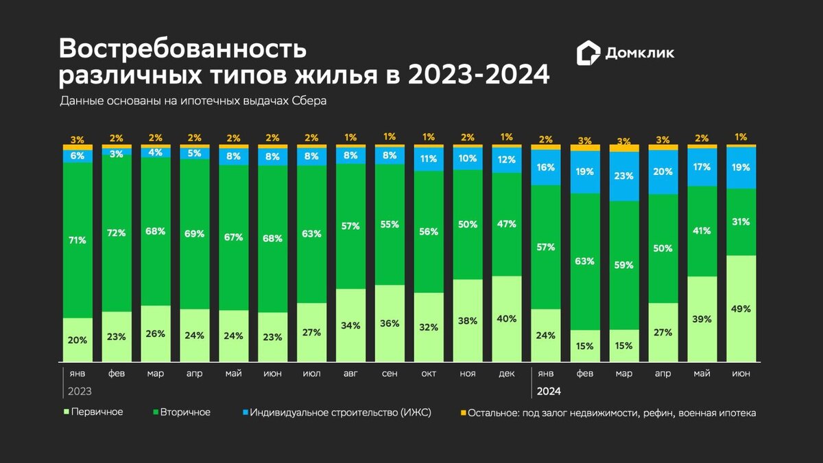 По итогам второго квартала 2024 года доля ипотечных сделок с новостройками выросла до 49%, следует из предоставленного пресс-службой Сбербанка исследования аналитиков «Домклик». Данные учитывают ипотечные сделки «Сбера». Как отмечают аналитики, в первом полугодии 2024 года ипотечная выдача уступила показателям как первого, так и второго полугодия 2024-го: было оформлено 124,6 тыс. кредитных сделок против 132,2 тыс. и 274,8 тыс. соответственно. Но ипотечный спрос существенно вырос к концу полугодия, указывается в материалах: если в первом квартале 2024-го «Сбер» выдавал 7–11 тыс. ипотек в месяц, то во втором показатель увеличился с 16 тыс. до 53 тыс. в месяц. «Доля новостроек в общем количестве выданной ипотеки также выросла с 17,9% (значение первого квартала) до 40,8% (значение второго квартала). При этом в июне показатель стал рекордным — 48,9%», — указывают аналитики. В «Домклик» отмечают также высокий спрос на ипотеку на рынке индивидуального строительства (ИЖС). С начала года выдач