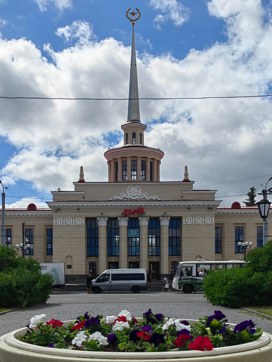 Пару заметок про интересные места в Петрозаводске я уже написал. Хотя по городу погулял всего несколько часов. Был там проездом на о. Кижи. Напишу и третью, про место, куда рекомендую заглянуть каждому. Даже, если вы приехали в город на машине. Я имею в виду здание железнодорожного вокзала. Изнутри оно мне напомнило здание вокзала в Выборге. Практически копия! По планировке и отделке колоннами по периметру точно. Кстати, выборгское здание изнутри я никогда почему-то не фотографировал. Наверное, из-за обилия туристов и сотрудников. А в Петрозаводске всё спокойно. Как пишет сайт РЖД, построенный в 1955 году по проекту ленинградского архитектора В. Ципулина, вокзал по сей день остается не только главными воротами Петрозаводска, но и одной из основных архитектурных достопримечательностей Республики Карелия. Ежедневно через него проходит свыше 1300 пассажиров. С 1916 года и до войны вокзал располагался в районе современного Первомайского проспекта (это два километра от центра города). Посл