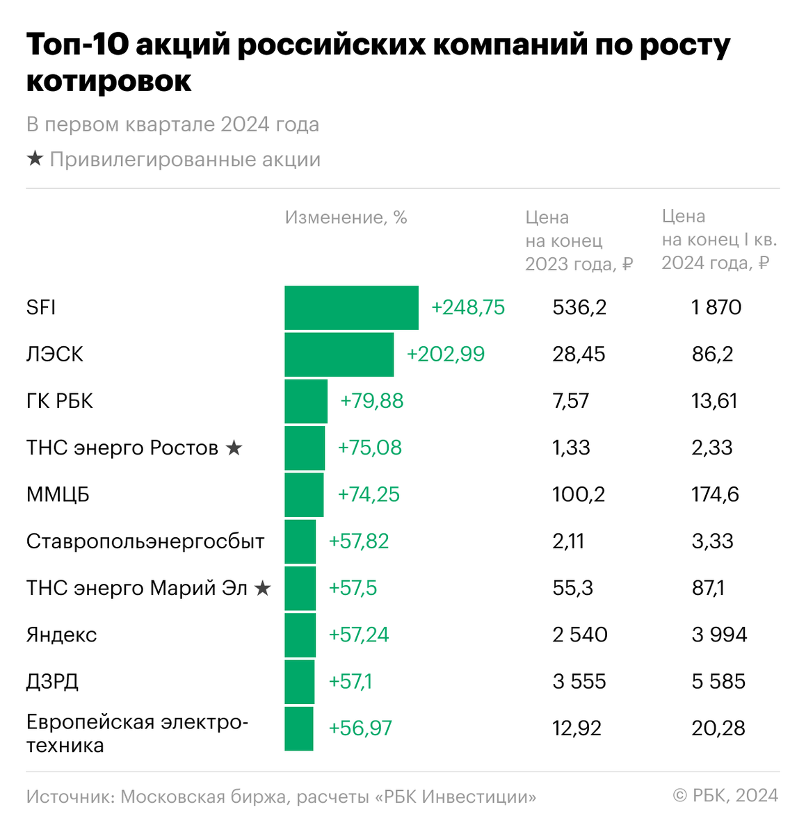 10 лучших акций первой половины и второго квартала 2024 года: рейтинг РБК