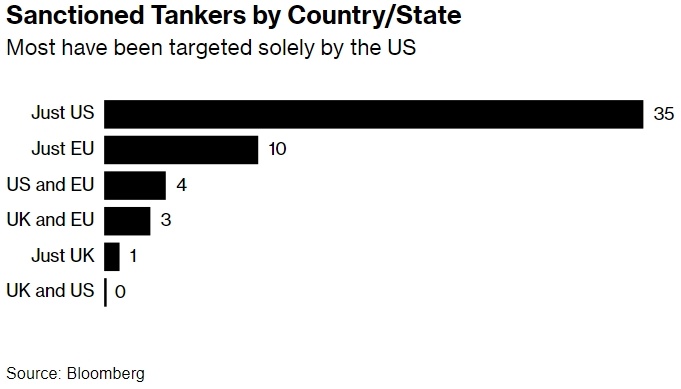 Танкеры, попавшие под санкции, по странам/государствам. Большинство танкеров попали под санкции исключительно со стороны США. Источник: Bloomberg