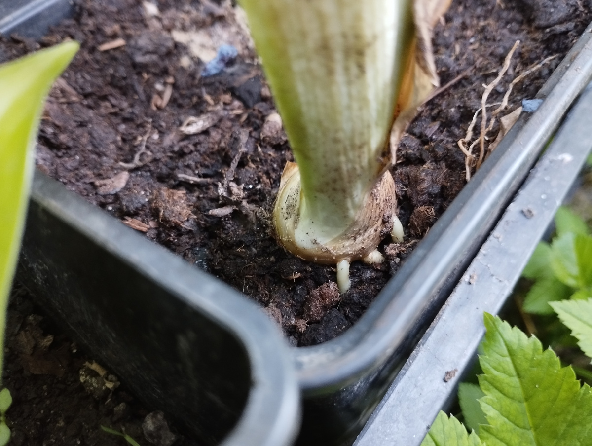 Сегодня обо всëм по чуть-чуть. Новости горшочков и стаканчиков. Самое эмоциональное - посылка с новыми хостами должна была быть уже на почте. Но что-то пошло не так на последнем участке пути. Я надеюсь, что привезли, но не успели занести в систему. Как-то не хочется думать, что они стоят в машине на солнце. Дальше о хорошем. Ирис (Swingtown), подаренный мне при покупке хост, отрастил свежие корни. Нового роста пока не видно, мало времени прошло, наверно. А на новенькой же хосте Curly Fries мне стало жалко срезать цветонос. У одной розетки убрала, а у второй нет. Хосты прижились под кустом жимолости. Солнце их не особо достаëт. Все же квадратные горшки и фруктовый ящик - идеальное сочетание. Из "новостей стеллажа" - малышки heuchera (дзен считает русское название нецензурным) меристемного размножения переехали из по индивидуальным стаканчикам. Листики уже начали показывать, что она будет не просто зеленая. Покупала как Silver Gumdrop. Интернет обещает такое Выбирала из того, что было