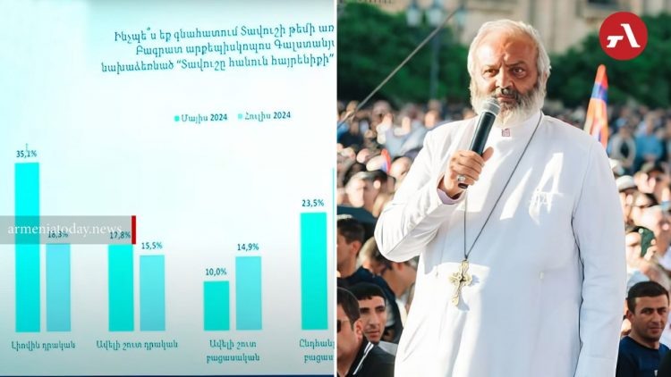 Около половины жителей Армении осудили возглавляемое архиепископом Багратом Галстаняном протестное движение «Тавуш во имя Родины», свидетельствуют данные опроса, проведенного MPG/Gallup International Аssociation с 3 по 6 июля в Армении. В телефонном опросе приняли участие 1100 респондентов. По словам главы MPG Арама Навасардяна, 47% респондентов высказались отрицательно, 34% опрошенных одобрили протесты. По данным опроса с 13 по 14 мая, больше половины жителей Армении одобрили движение «Тавуш во имя Родины». Глава MPG отметил, что 35,1% респондентов высказались абсолютно положительно к движению Галстаняна, 17,8% – скорее положительно, 23,5% – полностью отрицательно, 10% – скорее отрицательно, а 13,6% респондентов затруднились ответить. Большинство опрошенных, однако, осудило блокировку дорог и улиц сторонниками движения «Тавуш во имя Родины». Полностью отрицательно высказались 55,7% респондентов, 38% – одобрили, а 6,3% респондентов затруднились ответить. Движение «Тавуш во имя Родины»