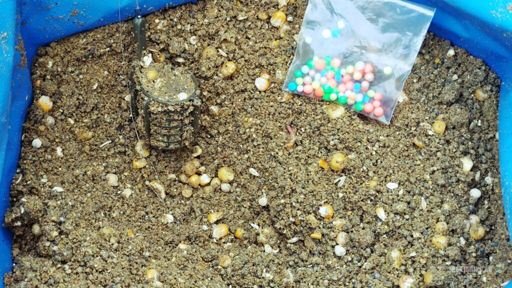 Для этого в сухую смесь вносятся и перемешиваются разваренные или распаренные зерна кукурузы, гороха, пшеницы, ячменя (перловка), пшена — компоненты из третьей группы. И делается это на водоеме, в тазике или ведерке, непосредственно перед увлажнением прикормки водой.