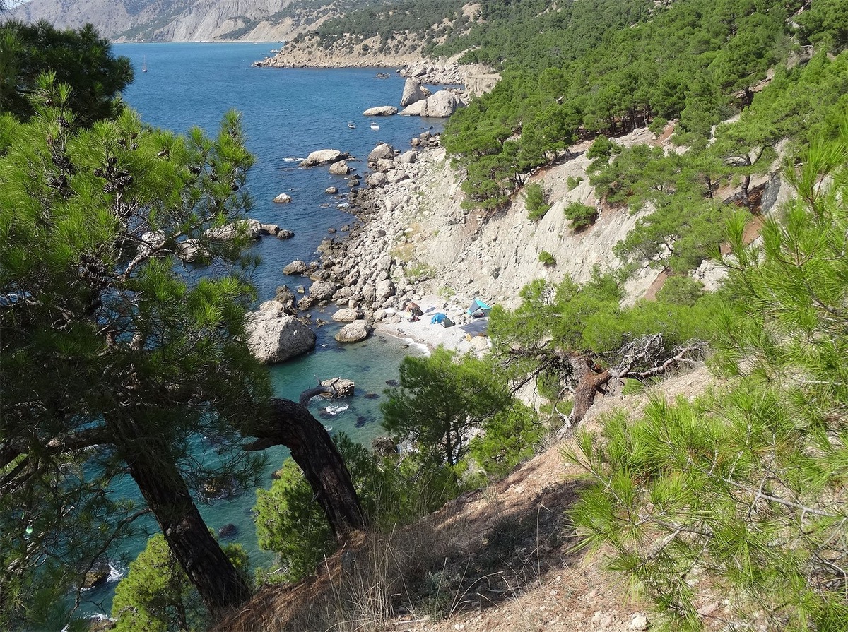 Прогулка на мыс Айя, что между Балаклавой и Батилиманом, нынче не такое безобидное удовольствие как несколько лет назад. От Крымского берега уже давно отщипывают лакомые куски под пансионаты и дачи, теперь добрались и до Айя. Итак, что можно найти на Кокия. Здесь интересности на любой вкус. Головокружительные виды на обрывы, горы и морские панорамы, средневековая крепость Кокия-Кала, бывшая военная часть, экстрим-скалолазанье. Описывать бесполезно, слов не хватит, чтобы передать все охи-ахи от нагромождения скал, от видов с высоты 600 м на ютящийся у подножья райский уголок – затерянный мир. Пальм там нет, но уютный пляжик, зелень сосен в наличии имеется. Летом там кишит муравейный городок нудистов и дикарей, которые прибывают сюда на яликах. Скальные нагромождения и морские пейзажи вне конкуренции. Видали всякие виды, но обрыв впечатлил. Мыс Айя – это территория заказника, здесь растёт, бегает и летает много чего редкого и интересного. В наш приход активно летали чёрные большие вороны