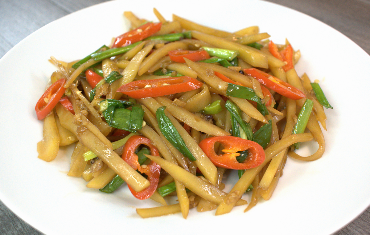 Налить немного растительного масла в вок, нагрев средний. Обжаривать сычуаньский перец 10 секунд. Добавить белую часть лука и чеснок, обжаривать 30 секунд. Добавить соевый соус, обжаривать 20 секунд. Добавить картофель. Обжаривать до полуготовности - картофель должен немного хрустеть. Добавить соль, куриный бульон, устричный соус. Перемешать. Добавить перец чили. Добавить зелёный лук, перемешать и подавать.