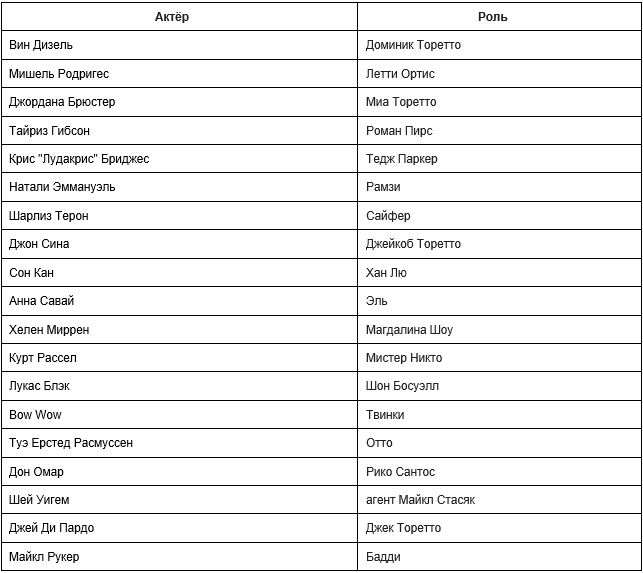 В июне 2019 года состав актёров пополнил Джон Сина. Позднее Финн Коул, Анна Савай и Винни Беннетт присоединились к актёрскому составу. Также стало известно о возвращении Хелен Миррен и Шарлиз Терон к ролям Магдалины Шоу и Сайфер соответственно. В августе Майкл Рукер вошёл в состав актёров.