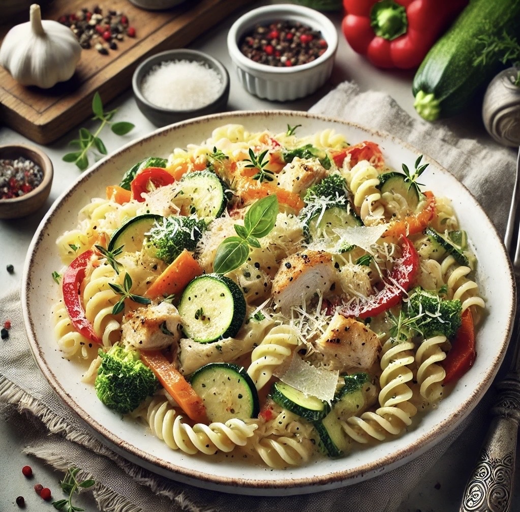Сегодня мы поделимся рецептом быстрого и вкусного блюда – пасты с овощами и курицей. Этот рецепт идеально подходит для занятых людей, которые хотят приготовить что-то вкусное и полезное за короткое время. Паста с овощами и курицей не только насытит, но и порадует вас своим нежным вкусом и ароматом. - 200 г пасты (спагетти, пенне или фузилли) - 300 г куриного филе - 1 средний кабачок - 1 красный болгарский перец - 1 морковь - 2 зубчика чеснока - 200 мл сливок (10-20% жирности) - 50 г тертого пармезана - 2 ст.л. оливкового масла - Соль и черный перец по вкусу - Свежая зелень для украшения (петрушка или базилик) 1. Подготовка ингредиентов: - Промойте куриное филе под холодной водой, обсушите бумажным полотенцем и нарежьте небольшими кубиками. - Овощи (кабачок, перец, морковь) промойте и нарежьте тонкими полосками или кубиками. - Чеснок очистите и мелко нарежьте. 2. Приготовление пасты: - В большой кастрюле доведите до кипения подсоленную воду и сварите пасту до состояния "а
