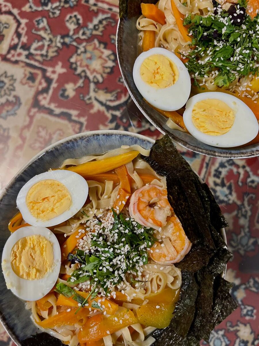 - разложить по тарелкам, выложить разрезанные яйца, добавить нори, посыпать зеленью, кунжутом и выжать по дольке лимона.