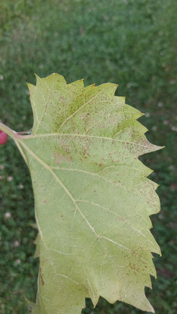 Скажем так, очень хорошие фото по качеству и ракурсу прислал Сергей, по которым я могу сразу определить причину проблемы, а именно повреждение отдельных секторов на листовой пластине. Вопрос поступил мне вчера поздно вечером и утром, при обходе виноградника я намеренно нашёл лист, имеющий повреждения от аналогичной "бяки".