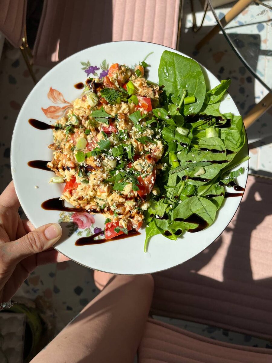 - выложить шпинат, выложить готовый скрембл, Фету нарезать кубиками и добавить к нему, посыпать нарезанной зеленью и полить бальзамиком