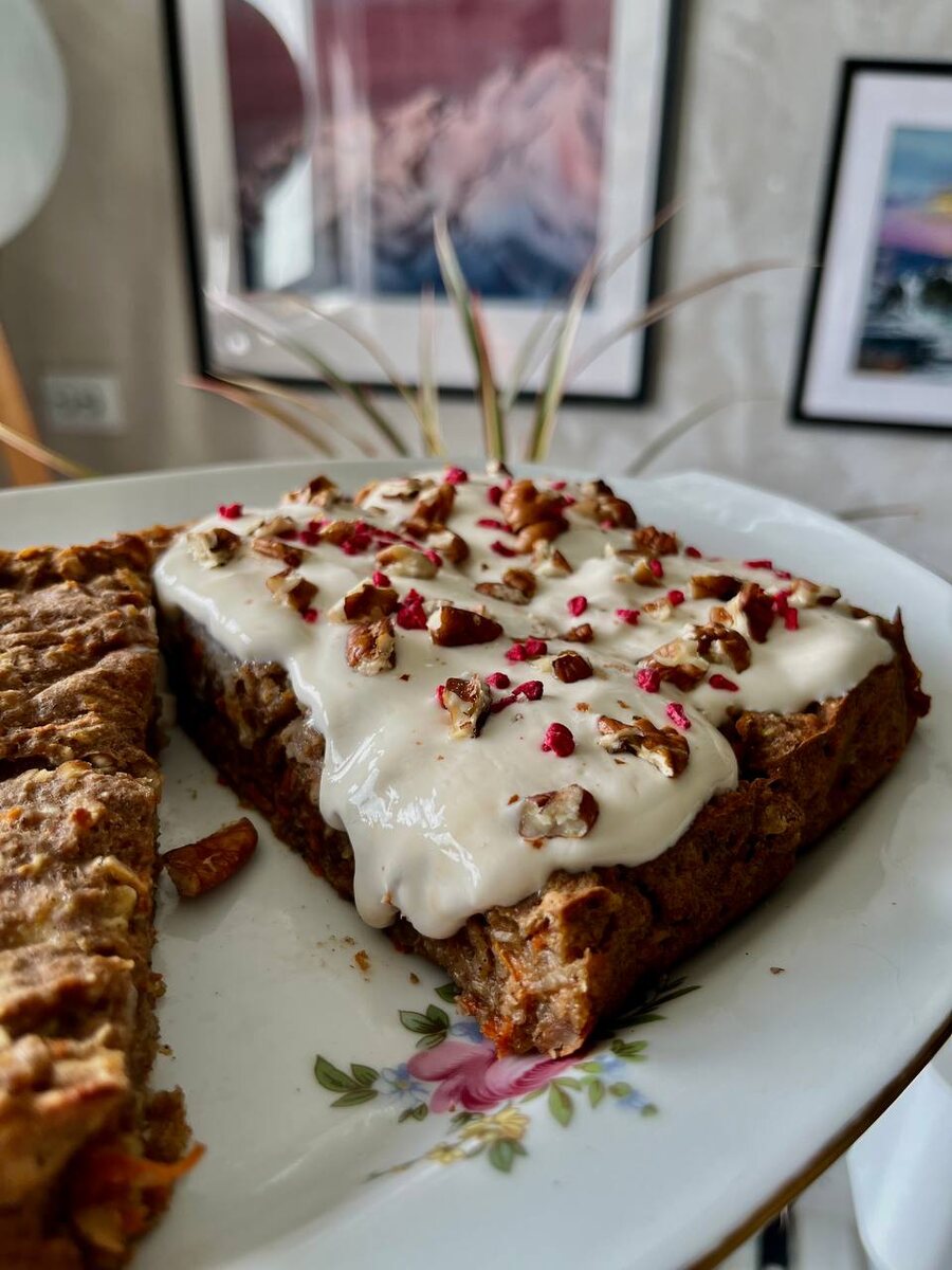 #завтрак #перекус для теста: Овсянка без/глют 1ст мука зеленой гречки (или любая другая)1 ст Молоко (кокосовое) 1 ст Банан 2 шт морковь 1 шт Корица 2ч/л пекан 1/2 ст Крем: Гречкский йогурт Мед 1ч/л украшение: Пекан Сублимированная малина • морковь натереть, бананы размять, пекан измельчить • все ингредиенты (кроме соуса) хорошо перемешать • получившееся тесто добавить в форму для запекания и равномерно распределить • запекать ~25-35 мин в разогретой духовке на 180с • греческий йогурт смешать с медом, полить готовый пирог и посыпать топингом по желанию 🤌🏻