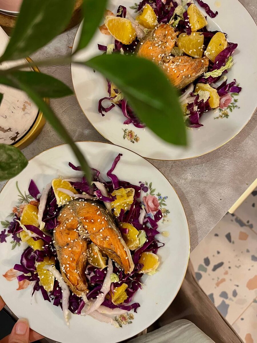 #ужин салат: Краснокочанная капуста Пекинская капуста Апельсин 1 шт стейк: Стейк нерки Соль/ перец Лимонный сок 1/чл соус: Оливковое масло 1ч/л Мед 1ч/л Сок апельсина 1ст/л Кунжут • рыбу посолить, поперчить, обжарить с двух сторон ~10 минут, полить соком лимона • порезать пару листов пекинской и один слайс краснокочанной капуст, добавить дольки апельсина • для соуса смешать оливковое масло, сок пары долек апельсина и мед, заправить блюдо и посыпать семечками по вкусу 🤌🏻