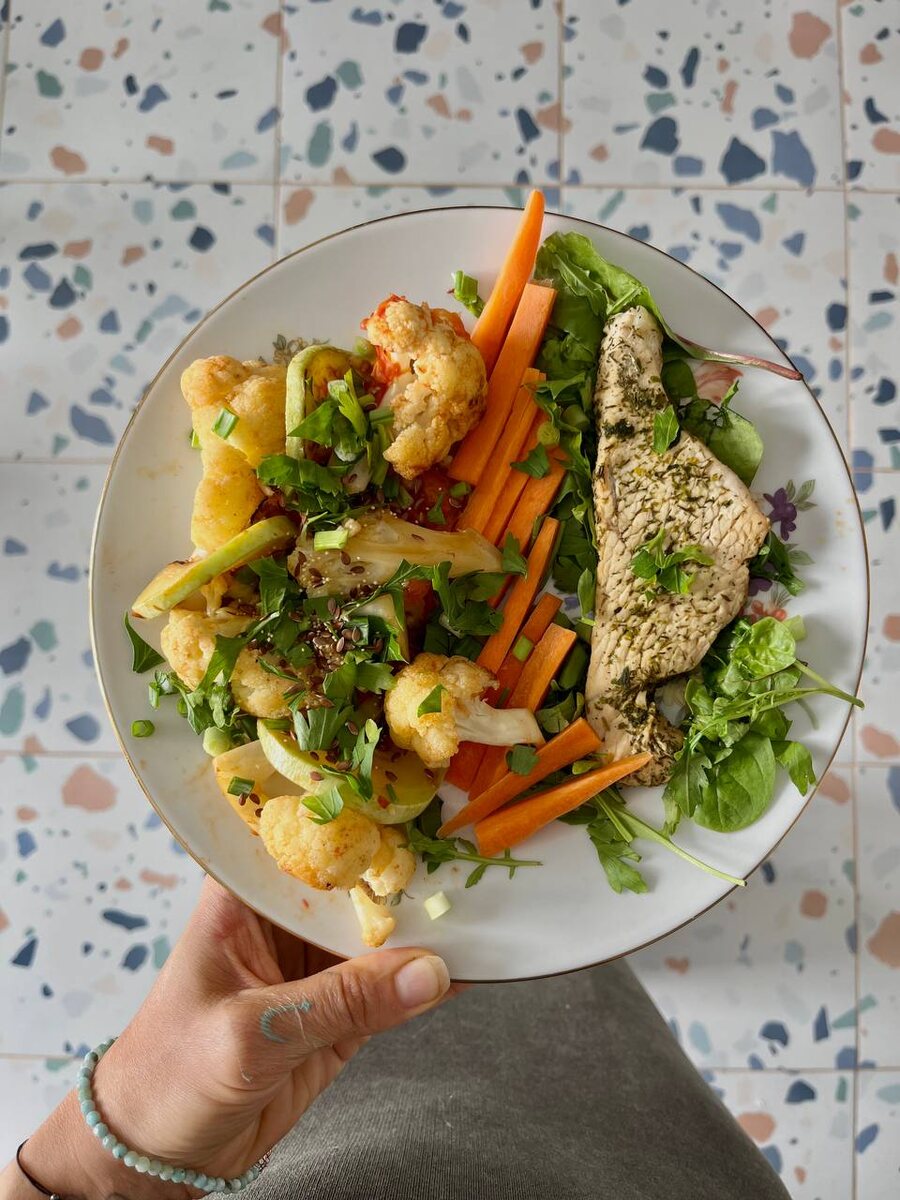 #завтрак Цветная капуста Цукини Карри Смесь зелени Морковь Стейк индейки Зелень лук/сельдерей Семена льна и кунжута • цветную капусту разделить на соцветия, цукини порезать полукольцами и потушить на сковороде, посолить, поперчить, добавить приправу карри • затем обжарить с двух сторон стейк индейки с солью, перцем • выложить овощи и индейку на подушку из зелени, добавит порезанную морковь и лук с сельдереем, посыпать семенами 🤌🏻 💧 стакан теплой воды за 30 минут до еды