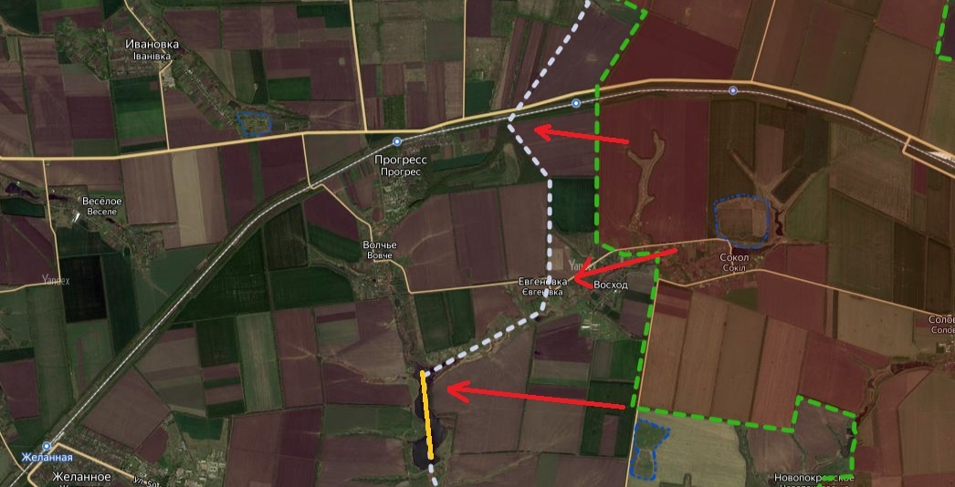 Продолжаем пристальнейшим образом следить за развитием ситуации на нашем любимым направлении. С момента последнего включения отсюда, произошло ещё несколько интересных событий (об одном из них в конце), а самое главное – наши продолжают развивать тут свой успех. Давайте, как всегда, пробежимся по всему району и посмотрим, где этот успех особенно сопутствовал нашим парням. Как обычно начнём с этого участка: Здесь нога в ногу с нашими парнями идёт и успех. Наши идут широким фронтом постепенно небратьев оттесняя всё дальше. Снизу от населёнников мы уже вышли к реке (отметили оранжевой чертой). В этом месте она широка, образуя эдакое водохранилище. Очень неплохая карта с инфографикой о том, что нам тут ещё осталось освободить: За небратьями осталось меньше половины села (выделили овалом). Наши парни там каждый божий день продвигаются и ничего они нам противопоставить не могут. Наши тут сожгли очередной «Абрамс»: Сначала наши его подловили, смогли пробить ему движок (фото справа, где масло