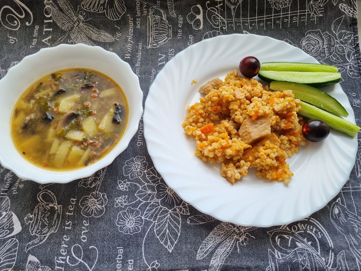 Доброе утро! Я тут немного подустала. Поэтому решила, что пока уменьшу "блогерский фронт работ"))))))) И вот получается десять дней я восстанавливала запасы энергии. Да и режим "бегунимагухочуготовить" так и не хочет включатся, а вот режим "антиготовка" совершенно не хочет выключатся. Поэтому эти десять дней я готовила максимально лайтово, вот вообще. Но фото все равно делала зачем-то)), видимо привычка уже. А тут вдруг решила, чего это они просто так в телефоне лежат, выложу-ка я их все таки))) Завтрак Завтрак конечно был, но я теперь не вспомню какой, так что "звиняйте")))) Обед На обед был грибной суп с фаршем. Вот как раз тот самый случай когда все еще выручает морозилка. Потому что фарш был уже готовый, обжаренный и поэтому суп варился всего минут 10. К супу был плов из сорго с индейкой и порезанные огурцы))) ну и черри затесались рядышком))) Ужин На ужин был просто грибной суп. Правда я потом черри потаскала еще просто так. Вы заметили даже любименьких салатиков нет((( Зато ест