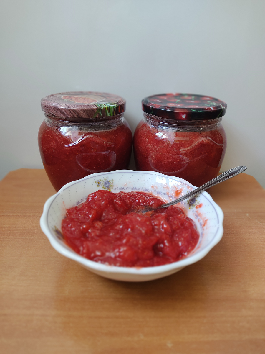 Доброго времени суток. Давайте приготовим варенье, очень схожее с конфитюром. У меня клубничное, но можно приготовить и с другими ягодами (черника, смородина, жимолость, крыжовник). И как всегда готовится очень быстро и просто. И так..... Поехали..... Клубника или другие ягоды – 1 кг Сахар – 350 гр Лимонная кислота – 1/3 ч.л. Желфикс от Dr Oetker 3 : 1 – 1 упаковка (соотношение 3 : 1 означает, что на 3 части ягод берем 1 часть сахара) Клубнику или другие ягоды хорошо помыть и просушить. Удалить хвостики. Измельчить ягоды при помощи блендера, так, чтобы оставались небольшие кусочки ягод. Смешать Желфикс с 2 ст.л. сахара, от общего количества , добавить в ягодную смесь. Довести до кипения, постоянно помешивая. Добавить оставшийся сахар и лимонную кислоту по вкусу, чтобы сбалансировать сладость варенья. Варить 3 минуты на маленьком огне. Снять пенку. Снять с огня и сразу разложить в сухие, заранее простерилизованные банки. Из этого объема продуктов получается 1 литр варенья.