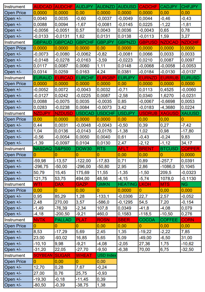 Весь перечень анализируемых активов указан ниже в общем количестве 60 инструментов. Здесь Вы найдете активы рынка Форекс, популярные активы Московской биржи, не менее популярные активы Чикагской биржи СМЕ и мажор криптовалютного сегмента - Биткоин, за которым следуют все альткоины.