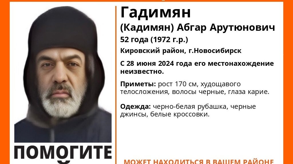 В Кировском районе Новосибирска пропал 52-летний Абгар Гадимян (Кадимян). Об этом сообщили в поисковом отряде «ЛизаАлерт». Местонахождение мужчины неизвестно с 28 июня 2024 года. В день исчезновения он был одет в черно-белую рубашку и черные штаны, а обут в белые кроссовки. Приметы: рост 170 см, худощавого телосложения, волосы черные, глаза карие. Если вам что-либо известно о местонахождении пропавшего, сообщите, пожалуйста, по телефону горячей линии отряда 8-800-700-54-52 (круглосуточно, бесплатно) или по номеру 112. Напомним, что Чистоозерном районе пропала миниатюрная пенсионерка с розовым ведром. Иван Быкадоров