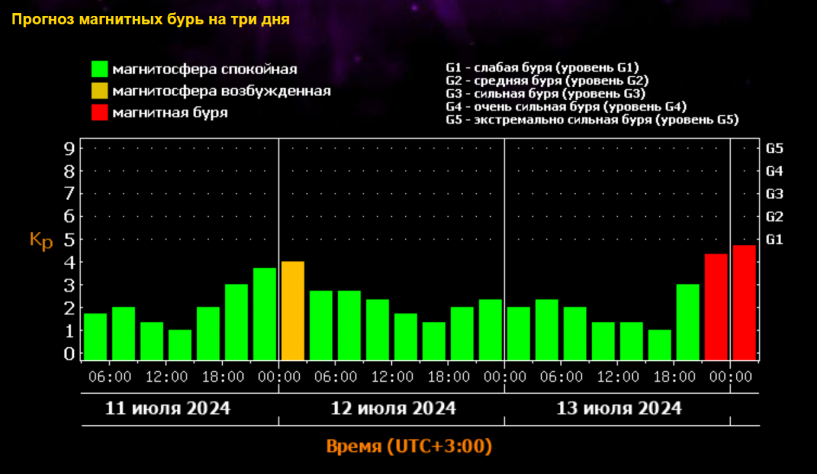 На сайте Лаборатории солнечной астрономии ИКИ и СИЗФ появился прогноз магнитных бурь на ближайшие дни. Геомагнитные возмущения начнутся уже в эти выходные. По прогнозу специалистов, в период с 21:00 13 июля до 03:00 14 июля магнитная буря достигнет уровня G1 (слабая буря). Напомним, метеозависимые люди во время магнитных бурь могут почувствовать ухудшение состояния: головную боль, скачки артериального давления, головокружение, затруднённое дыхание, нарушение сна, тревожность, усталость и раздражительность. Ранее сообщалось о погоде на конец этой недели. В пятницу, 12 июля, в Омской области ожидается +32 градуса. Местами пройдут кратковременные дожди, грозы, ночью в отдельных районах возможен туман. В субботу, 13 июля, жара сохранится. Ночью в отдельных районах снова будет наблюдаться туман, кратковременные дожди и грозы. Температура воздуха днём составит от +27 до +32 градусов.