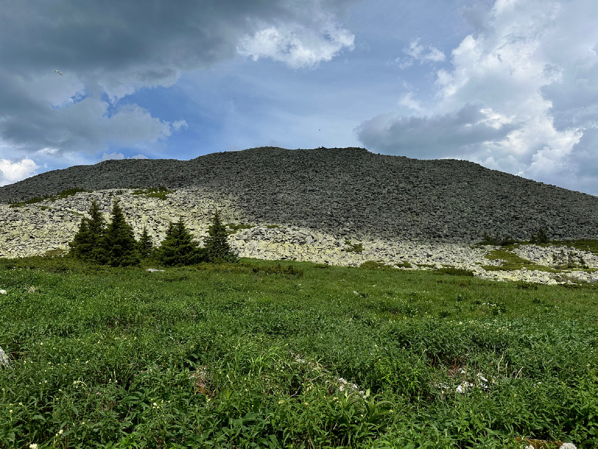Пообедав и вдоволь отдохнув, выдвинулись на маршрут. Следующей контрольной точкой была вершина Круглая (1371м.). Недалеко от кемпинга мы сбросили рюкзаки и дальше отправились “налегке”. Как же удобно ходить без рюкзаков. В тоже время воды взяли впритык, примерно по 2 литра, ибо большее количество взять просто некуда. Путь к вершине протекал по тропе, огибающей Поперечную. В какой -то момент мы вышли на седловину между Круглой и Поперечной и ахнули. Насколько же здесь красиво. Настоящие альпийские луга. Все вокруг было невообразимо прекрасным. Цветы, растительность, пение птиц. Уровень нашего восторга не передать. Подъем на гору не составляет никакого труда. Уклон довольно пологий, порыт мелкой растительностью, так что взобрались мы на нее довольно быстро. Восхищению от увиденного не было границ. С одной стороны, переливаясь в лучах солнца стоит прекрасная вершина Поперечная, с другой стороны река Юрюзань утекает куда -то вдаль, но больше всего завораживает вид на остальную часть хребта. Эмоции в этот момент просто зашкаливают и растворяют накопленную ранее усталость, словно дымку. Недалеко от высшей точки горы, расположилось интересное скальное образование под названием Каменный город. В тоже время над Тюлюком стеной стоял дождь и это было для нас сигналом, что пора продолжать маршрут, ведь сегодня необходимо было пройти еще две вершины.