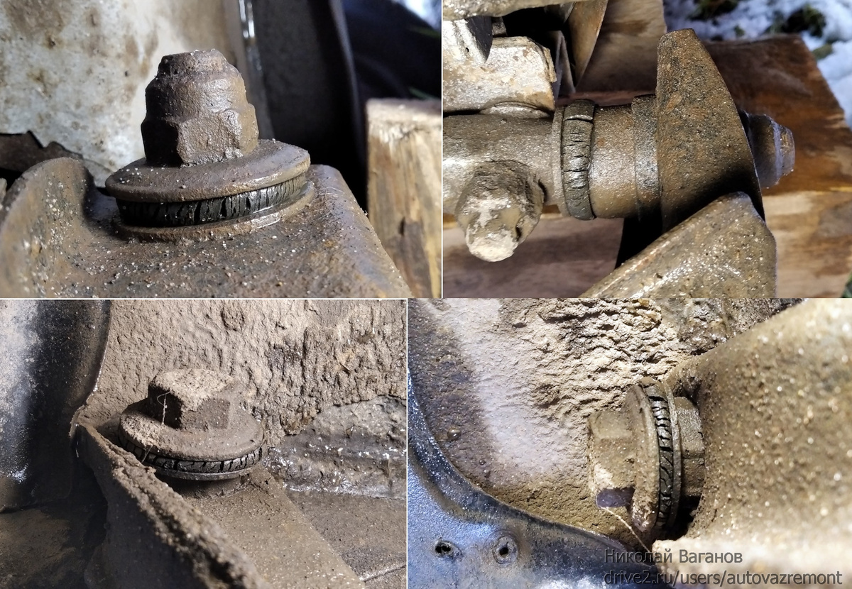 С одним сайлентом возникла проблема, его внутренняя втулка прикипела к оси, видимо, из-за лопнутой шайбы еще при первой замене — внутрь попала вода, вымыла смазку и заржавело. Пришлось выжигать резину горелкой и выбивать втулку зубилом, шайбу также заменил, в любом случае ей бы хана была, поэтому лучше заранее ими запастись.