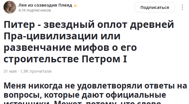 На скамье подсудимых новый претендент на доску позора нетрадиционной псевдо-истории Сходу-сразу автор начинает играться шрифтом, вкидывая тезисы без обоснования у официальной истории Санкт-Петербурга большие проблемы: уж слишком много несоответствий, домыслов, притянутых за уши фактов и просто всякой несуразицы вокруг прошлого Весьма ново и свежо. Ни разу альто не искали в истории Санкт-Петербурга некие элементы "историки скрывают" и вот опять. Самое интересное, что обосновывать наличие некой пра-цивилизации одним единственным городом, это как бы расписываться в собственной лжи. Ведь некая загадочная цивилизация, что обладала недостижимым технологиями (об этом ниже), жила, по всей видимости, в одном единственном населённом пункте. А вокруг только пустота. Хотя даже наша, столь отсталая от атлантов и асов, цивилизация успешно стоит многочисленные города с приблизительно одинаковой архитектурой и инфраструктурой. Но вот один из оплотов Периметра великой Расы На территории нашей стра