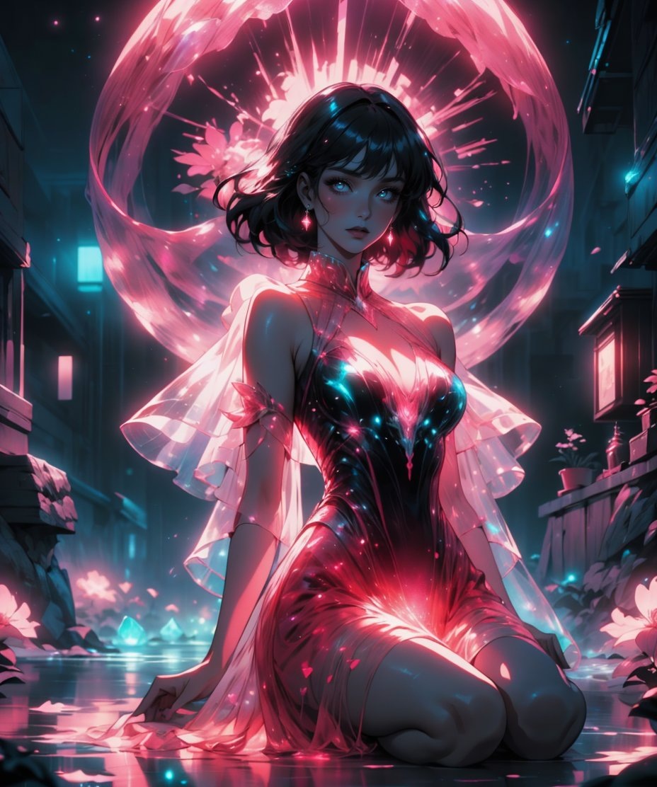 биолюминесцентное платье-свободное платье с украшением, длинная розово-фиолетовая прическа «рыбий хвост» с эффектом омбре, на неоновом уличном рынке