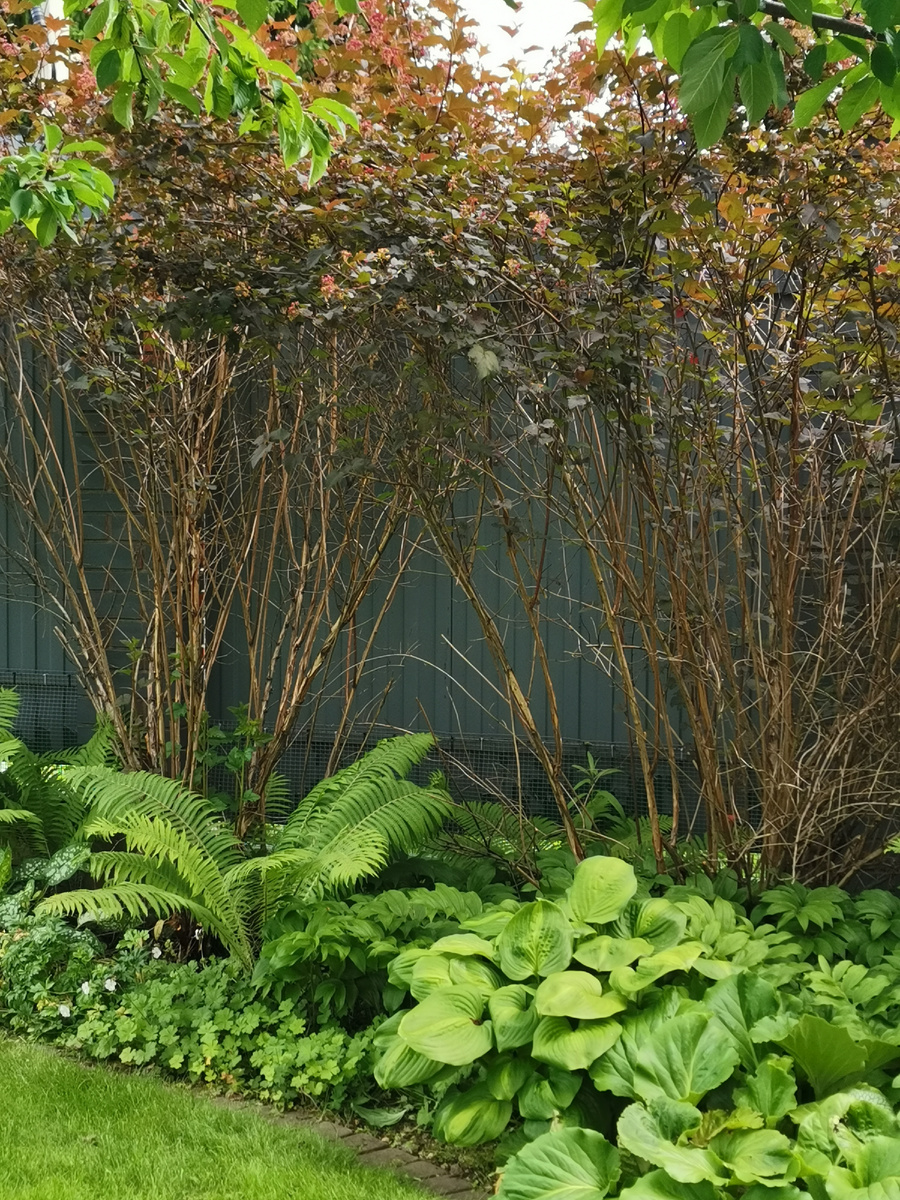 Бывает так - не устраивает тебя что-то в окружающей среде, или чего-то не хватает, но думаешь - да нет, это слишком трудоемко делать, тяжело, трудозатратно, дорого, нерационально, да и вообще как-то неразумно. А потом вдруг щелкнет что-то в башке - и думаешь, а почему бы и нет? В общем, добралась я до своих пузыреплодников Диабло, которые росли в качестве живой изгороди вдоль забора из профнастила. Помню, я на них как-то пожаловалась, выложила фото, и в комментариях кто-то написал: "У, какие огромные, ну все, пожили уже, хватит, пора и на свалку!" Я так смеялась, и до сих пор вспоминаю и смеюсь) Тогда немного удивилась, ведь считается, что подрощенные растения выкидывать особенно жалко, а теперь я пожалуй согласна с тем комментатором) Пузыреплодников этих у меня 5 штук, они выросли выше забора, никакой красоты в них уже нет (да и не было, если честно), ноги оголились, наверху непонятная темная масса, и выгдядит все это просто как темный провал. Фото ДО я, как обычно, сделать забыл