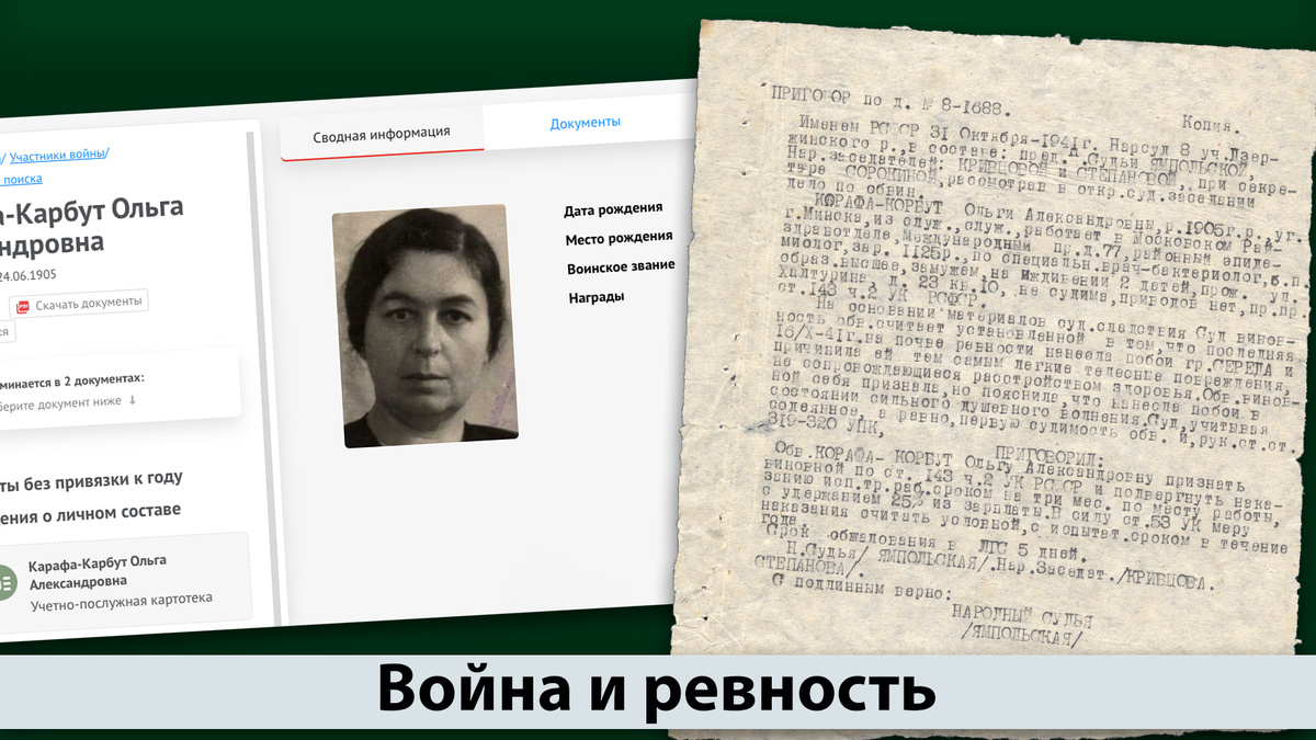 На Миллионной улице (в 1941 году ул.Халтурина) в доме № 23, в коммунальной квартире № 10, жила с семьёй Ольга Александровна Карафа-Корбут. Далее привожу текст из копии приговора Народного Суда, заседание которого состоялось 31 октября 1941 года «Именем РСФСР 31 октября 1941 года Нарсуд 8 участка Дзержинского района, в составе: пред. Судьи Ямпольской, Нар.заседателей: Кривцовой и Степановой, при секретаре Сорокиной, рассмотрев в открытом судебном заседании дело по обвинению Карафа-Корбут Ольги Александровны, р. 1905 года рождения, уроженка г. Минска, из служащих, служащая, работает в Московском райздравотделе, Международный проспект, дом 77, районный эпидимиолог, зар. 1125 р., по специальности врач-бактериолог, беспартийная, образование высшее, замужем, на иждивении 2 детей, проживает: улица Халтурина, д 23., кв. 10, не судима, приводов нет, пр. пр.