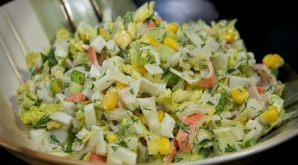 5. Нарежьте крабовые палочки небольшими кусочками и также добавьте в салатник.