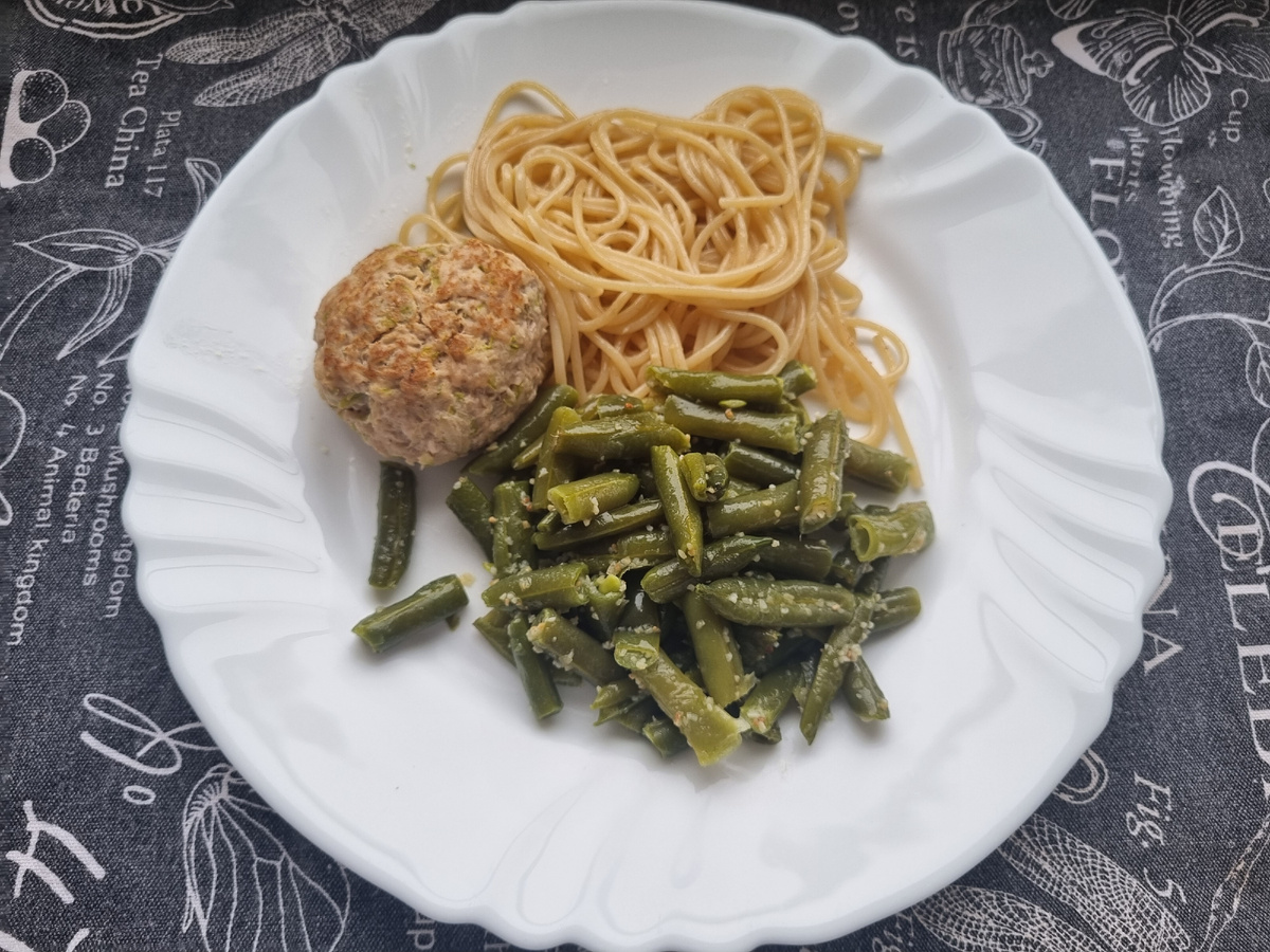 Завтрак На завтрак был ролльный эксперимент. Но я почему-то не сфоткала его. В общем я сделала сладкий творожный ролл с какао, чиа и маком в тесте, а начинкой была рикотта с бананом. Обед На обед была свино-индейская котлета с кабачком, стручковая фасоль с чесноком в сливочном масле и спагетти. Ужин На ужин была тушеная курица с овощной нарезкой. У нас холодно, всего +9, дождь, поэтому хочется сытной еды. А ещё все соблазняют борщом. Я думала борщ теперь будет только осенью, но чувствую он будет уже на следующей неделе.