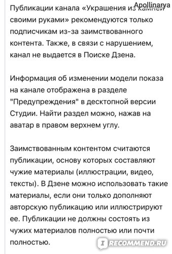 Этим контентом оказался мой отзыв про заработок на irecommend. На тот момент, когда я начинала вести канал, я не знала, что нужно ставить перекрестные ссылки на каналы. В начале статьи было указано, что я пишу на айреке и это моя статья. Но видимо этого было мало и мой канал попал в блок. Сообщение об этом мне никуда не поступало. Видимо я должна была догадаться.