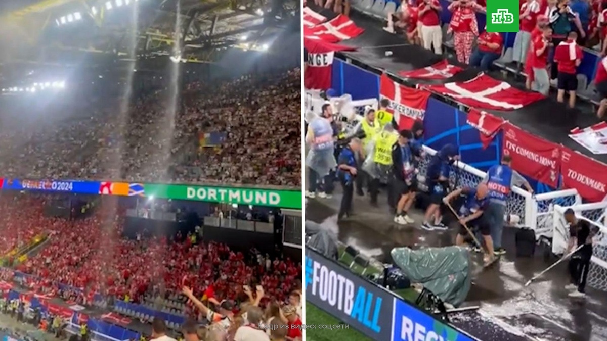 [ Смотреть видео на сайте НТВ ] Встречу сборных Германии и Дании на чемпионате Европы пришлось остановить из-за непогоды. Матч 1/8 финала чемпионата Европы проходит в Дортмунде. Во время встречи между командами Дании и Германии начался сильный ливень с грозой и градом. Уже в середине первого тайма арбитр встречи Майкл Оливер из-за разбушевавшейся непогоды увел команды к кромке поля, а затем и в подтрибунное помещение. В пресс-службе Союза европейских футбольных ассоциаций сообщили, что решение о продлении матча будет принято позже. Встречу приостановили при счете 0:0. Смотреть матчи Евро-2024 можно в прямом эфире на сайте НТВ.Ru. [ Смотреть видео на сайте НТВ ]