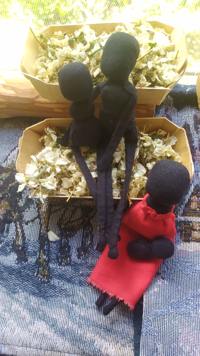 1 этап - женская фигурка. Поэтапно расскажу,как сотворить семью африканцев. Начнём с женской куколки . Необходимые материалы: -лоскут любой чёрной ткани ( лён,хлопок,трикотаж); - прочные чёрные нитки; -линейка; - ножницы; - вата; -иголка; - разноцветные лоскуты для одежды и декора; - золотые или жёлтые нитки для украшений. 1. Возьмите квадрат чёрной ткани произвольного размера. От размера квадрата зависит размер куклы. У меня 12/12 см 2. Скатайте из ваты плотный шарик диаметром 1.5 см и вложите в центр квадрата. Для пластичности ткани и ваты смочите их водой из пульверизатора . 3. Заведите уголки ткани назад, расправьте все морщинки на ткани и зафиксируйте ниткой на уровне шеи,формируя голову без складок. 4. Расправте ткань и под головой вложите внутрь небольшой валик из ваты. Зафиксируйте ниткой крест на крест ,формируя грудь. 5. Обмотайте ниткой под грудью куклы,формируя талию. 6. Возьмите тугой комочек ваты и вложите в оставшиеся свободными концы квадрата, подогните их н