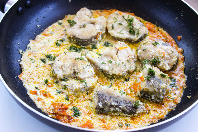 Минтай в сметанном соусе получается сочным и очень нежным, с ароматом чеснока и укропа. Простое блюдо на каждый день. Готовится быстро, а съедается еще быстрее! Совет! Подобным образом можно приготовить любую белую рыбу (треску, хек и т.п.), но вкуснее всего получится из минтая. Рыбу разморозить, тщательно вымыть, поскоблить ножом, срезать плавники, выпотрошить (не забудьте убрать черную пленку). Нарезать на порционные куски. Посыпать приправой для рыбы, перемешать. Оставить в таком виде минут на 10-15, пусть пропитается ароматами трав и специй. В составе моей приправы для рыбы присутствует соль, если в вашей ее нет, то нужно добавить. Тем временем очистить морковку, натереть на терке с крупными отверстиями. В сковороде разогреть 1 столовую ложку растительного масла. Обжарить морковь до красивого золотистого цвета, регулярно помешивая, чтобы не подгорела. Переложить обжарку отдельно в тарелку. На освободившуюся сковороду влить оставшееся масло. Обвалять кусочки рыбы в муке, а затем обж