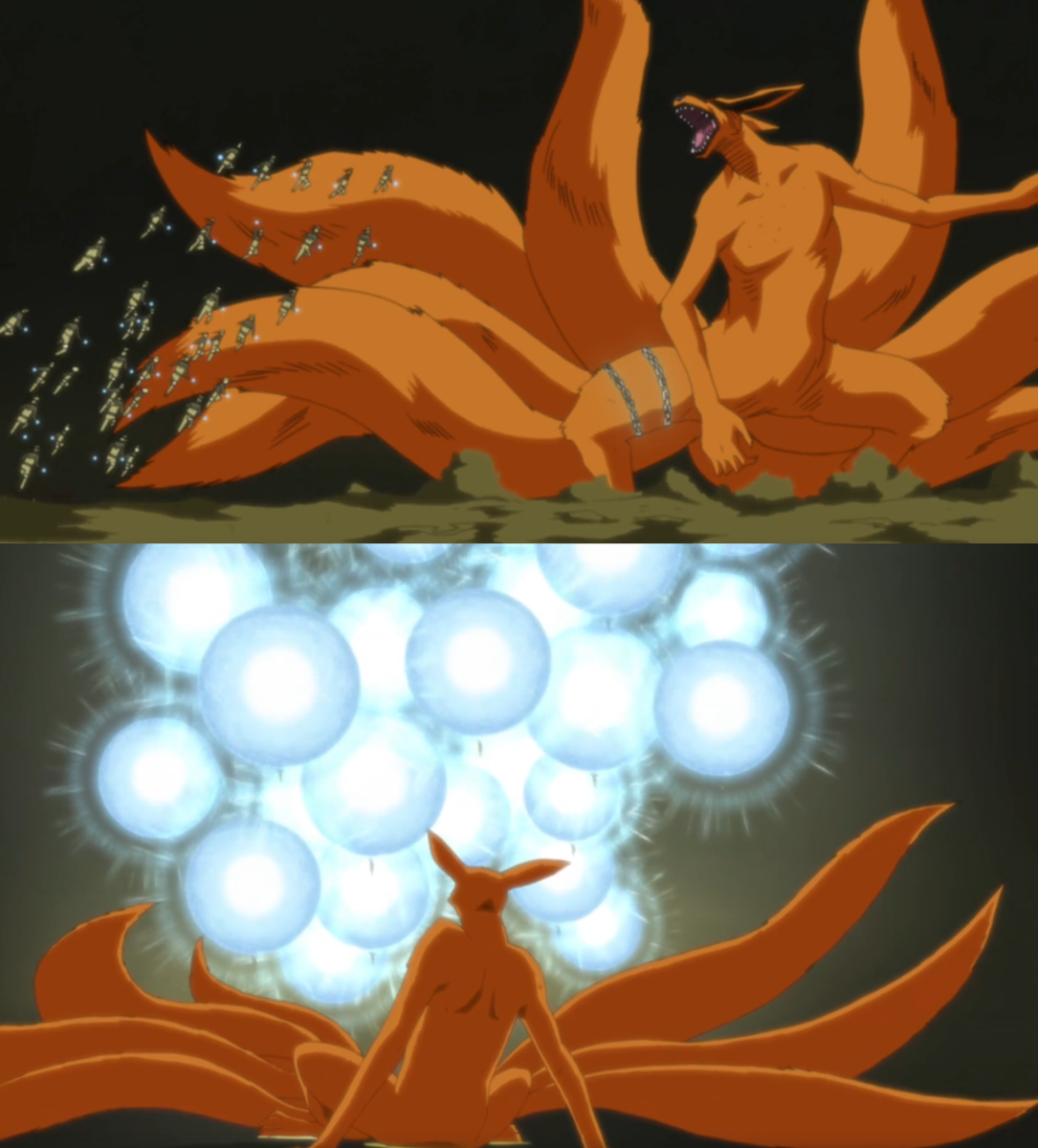 Пока Лиса сковывают Цепи Чакры, Наруто использует свою стандартную тактику: массированный клон-раш, сперва пытаясь одолеть Кьюби обычными Расенганами (ну, для Лиса это было бы, как обстрел из "воробьёвки", что не очень приятно, но не смертельно), однако, от этой атаки он просто отмахивается, поэтому Наруто переходит в Режим Мудреца, превращая свои обычные Расенганы в СУПЕР-МАССИВНЫЕ Расенганы, что уже равносильно для Лиса закидыванием булыжниками, размером с голову (что, кажется, смертельно).