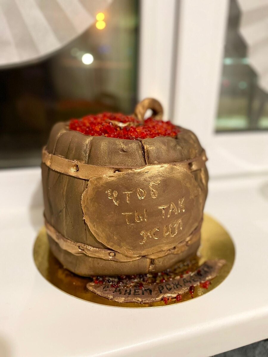 Тесто: Крем: Для украшения : Приготовление: Тесто : В миске смешиваем муку, какао и разрыхлитель. В чаше миксера взбиваем яйца с сахаром. Добавляем масло и сметану, размешиваем. Муку с какао и разрыхлителем также добавляем в тесто. Делим тесто на три части и выпекаем коржи в разогретой духовке до 180 градусов 30-35 минут. Готовность проверяем зубочисткой. Крем: Чернослив залейте горячей водой и дайте постоять. После слейте воду, а чернослив мелко нарежьте. Орехи измельчите. В чаше миксера смешайте творожный сыр, сахарную пудру, сметану и сливки. Взбейте. Смешайте крем с черносливом и орехами. Фальш икра: Приготовление: Растительное масло охлаждаем в морозилке, желательно не менее 3 часов. Готовим желе на основе сока. Замоченный желатин вводим в горячий сок. Набирае желе в шприц и капаем в охлажденное растительное масло. Через ситечко процеживаем икру. Крем под мастику: Соберите торт. Украсте мастикой и Фальш икрой. Подписывайтесь, пишите, всегда рада позитивным ком