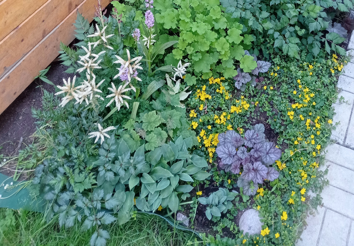 Пока, в конце июня, клумба в тени выглядит вот так, все астильбы собраны здесь, но еще не цветут.