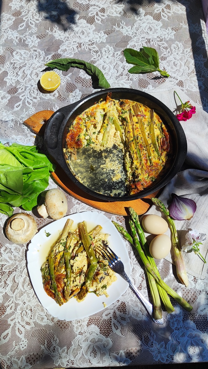 Идет сезон спаржи. У меня есть проверенный рецепт вкусного блюда - фриттата с зеленой спаржей. Фриттата - это разновидность итальянского омлета, который может быть приготовлен в разных вариантах. Предлагаю сделать фриттату со свежей спаржей, королевскими шампиньонами, красным луком, сочным зелёным салатом латук и твёрдым сыром качотта. Посмотрите, насколько просто и быстро можно приготовить это блюдо, и насколько вкусно и сытно оно одновременно. Ингредиенты: 200 гр зелёной 1/2 красного лука 150 гр королевских шампиньонов 100 мл сливок 4 яйца 150 гр сыра качотта (можно пармезан) 50 гр свежего салата латук 1/4 лимона адыгейская соль, сушеный базилик, паприка оливковое масло для смазывания формы Готовим: 1) Смажем форму для запекания оливковым маслом, 2)Выложим в форму грибы, нарезанные ломтиками, красный лук полукольцами, спаржу сверху, посолим и немного сверху сбрызнем лимонным соком. 3) Поставим в духовку форму на 15 мин на 180 гр. Тем временем сделаем заливку: 4 яйца и 100 мл