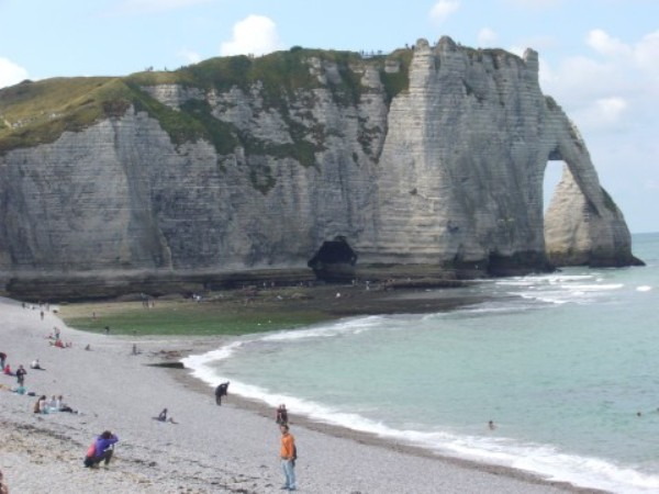 В Нормандии немало уютных небольших курортных городков. Один из самых посещаемых туристами – Этрета. Туда мы и отправились. Этрета расположен на Алебастровом берегу – белоснежном побережье, протянувшемся на сотню километров. Берег получил свое название из-за меловых гор, характерных для этой местности Нормандии. По другую сторону Ла-Манша в Великобритании расположено аналогичное побережье с утесами Дувра. Этрета означает «хутор заходящего солнца». Именно здесь пейзажи являют собой особенно великолепное зрелище — огромные обрывистые скалы, уходящие в море, пронизаны обширными арками, а невдалеке от берега одинокая скала, как обелиск, возвышается на семьдесят метров над водой. Эти причудливые формы, привлекающие всеобщее внимание, сотворили вода, ветер и время. Скалы Алебастрового берега — это один из самых часто фотографируемых пейзажей Франции. Грандиозность здешних скал и шум прибоя на галечном пляже произвели на нас незабываемое впечатление. Впрочем, подобное потрясение испытали до