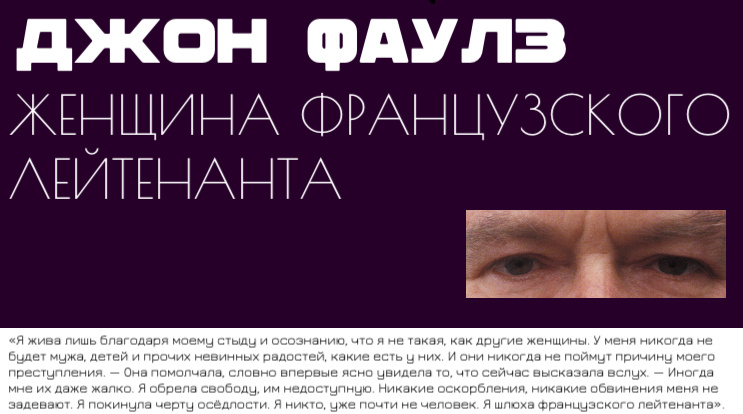 Я жива лишь благодаря моему стыду и осознанию, что я не такая, как другие женщины. У меня никогда не будет мужа, детей и прочих невинных радостей, какие есть у них. И они никогда не поймут причину моего преступления. — Она помолчала, словно впервые ясно увидела то, что сейчас высказала вслух. — Иногда мне их даже жалко. Я обрела свободу, им недоступную. Никакие оскорбления, никакие обвинения меня не задевают. Я покинула черту осёдлости. Я никто, уже почти не человек. Я шлюха французского лейтенанта. Автор и выбор книги. Джон Фаулз — известный английский писатель XX века, впечатливший меня ранее своими психологическими триллерами с нестандартными драматичными историями без хеппи-энда («Коллекционер» и «Волхв»). Опираясь на проверенное мастерство автора, а также на сюжет, ставящий под сомнения моральные устои (люблю такое), я приступила к чтению «Женщины французского лейтенанта». (В другом переводе «Любовница французского лейтенанта»). Прежде чем описывать сюжет, важно сказать, что Джо