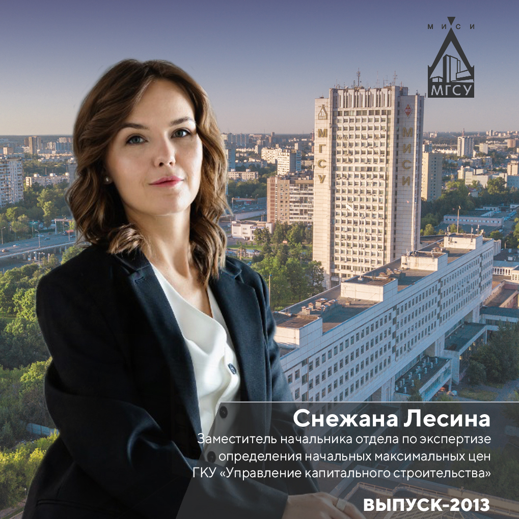 Выпускница НИУ МГСУ Снежана Лесина вышла в полуфинал IV Всероссийского конкурса управленцев «Лидеры строительной отрасли». Снежана с отличием окончила Московский государственный строительный университет в 2013 году, и с тех вся ее трудовая деятельность связана со строительной отраслью. Свой карьерный путь она начинала инженером в небольшой подрядной организации, а сейчас работает заместителем начальника отдела по экспертизе определения начальных максимальных цен в подведомственной организации Департамента строительства г. Москвы — ГКУ «Управление капитального строительства». За высокие трудовые показатели Снежана Лесина награждена благодарственным письмом от заместителя мэра Москвы по вопросам градостроительной политики и строительства. Снежана является очень разносторонней личностью — увлекается альпинизмом (в прошлом году осуществила восхождение на Эльбрус со знаменем Департамента строительства), бегом (участвует в забегах, на счету в этом году 2 медали за дистанцию 10км), изготовлен